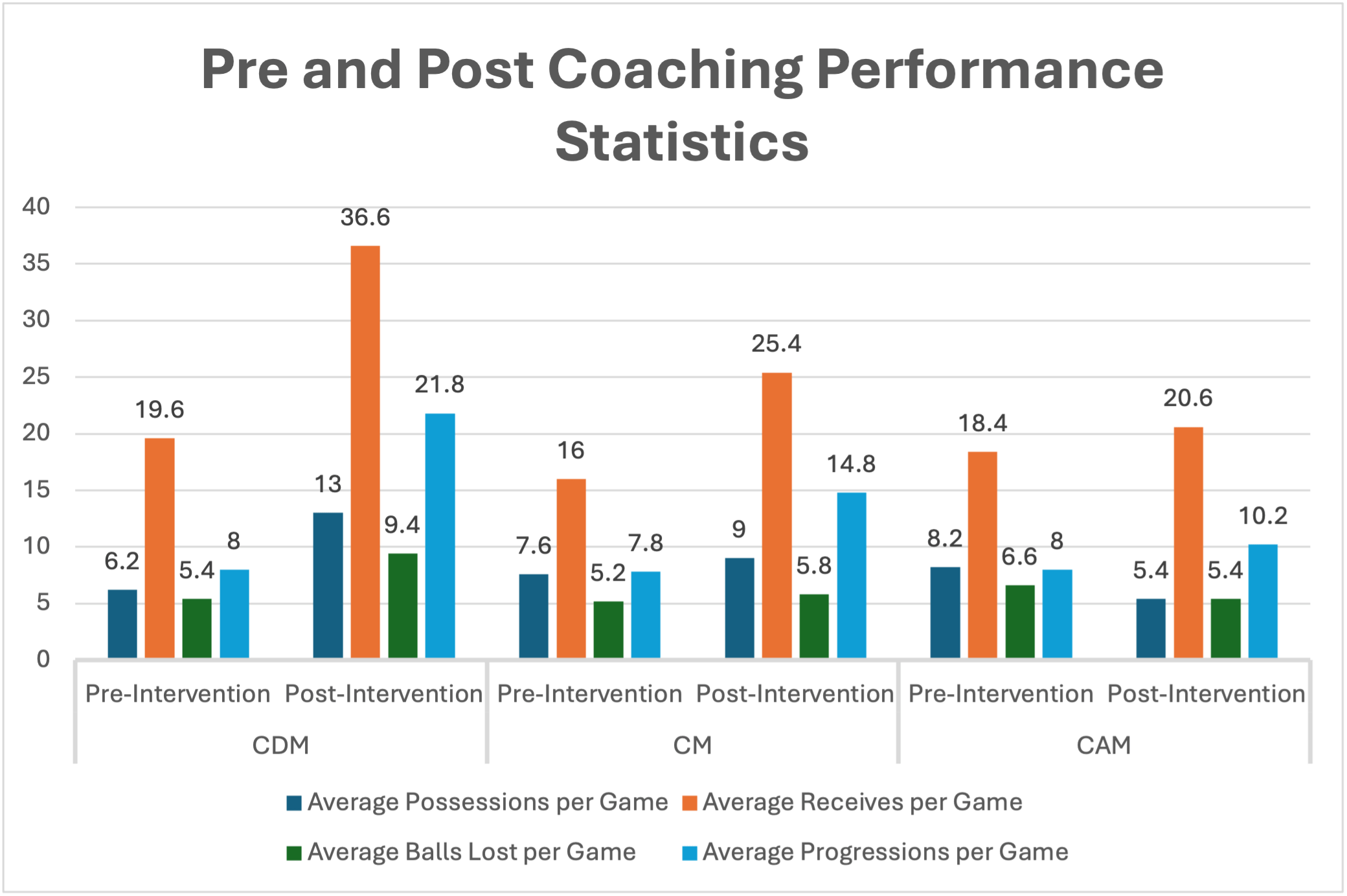 For each game, players’ actions were analysed according to their midfield role — pivot (CDM), central midfielder (CM), or attacking midfielder (CAM). The results show that the players made clear improvements in how effectively they progressed and managed possession following exposure to the coaching programme.
